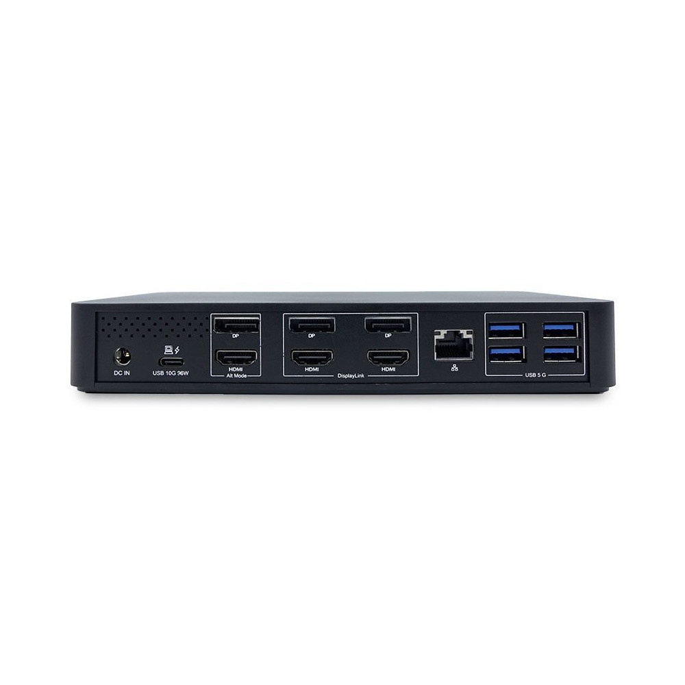 Diese Dockingstation ermöglicht den Anschluss von Peripheriegeräten, wie z.B. bis zu 3 Bildschirme mit bis zu 4K (Triple Display) oder 5K (Single Display). Ein angeschlossenes Device wird über die Dockingstation automatisch über USB-C mit bis zu 96W geladen. Am Front USB-C 3.2 Gen 2 können Geräte mit bis zu 20W aufgeladen werden.